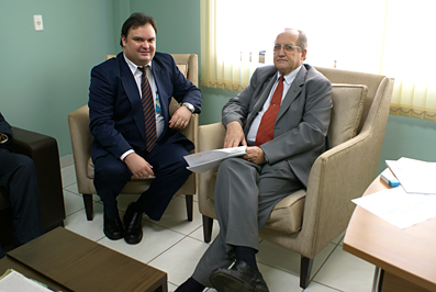 O gerente comercial Cristiano Marcelo da Silva e os gerentes de relações institucionais Patrick de Azevedo Ferreira e Ricardo Borges Leite explicaram ao chefe do Poder Judiciário a fusão realizada entre as empresas Brasil Telecom e Oi e a nova forma de atuação da companhia de telecomunicações.
