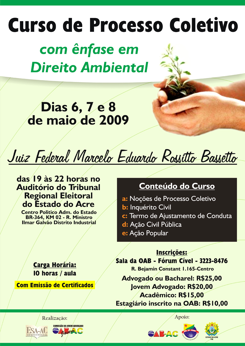 A Escola Superior de Advocacia da Ordem dos Advogados do Brasil – Seccional Acre (ESA-AC), realizará nos próximos dias 6, 7 e 8 de maio, o curso de curta duração intitulado “Processo Coletivo em ênfase em Direito Ambiental.