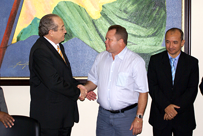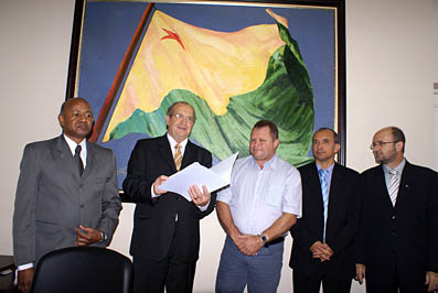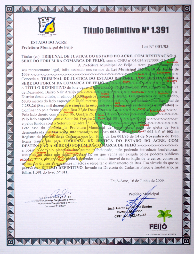 O Presidente do Tribunal de Justiça do Acre, Desembargador Pedro Ranzi, recebeu no dia 19 de junho, no Palácio da Justiça, a visita do Prefeito de Feijó, Juarez Leitão, que fez a entrega oficial do Título Definitivo nº 1.391, da área de terras onde será construído o novo Fórum da Comarca.