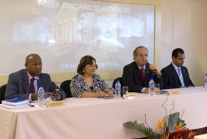 O próximo palestrante foi o Corregedor Geral de Justiça, Desembargador Samoel Evangelista. Atuação, normas e a relação com o Conselho Nacional de Justiça (CNJ) foi o tema de abordagem do Corregedor, que levou os Juízes Substitutos a conhecerem melhor os números atuais do Judiciário nacional e acreano.