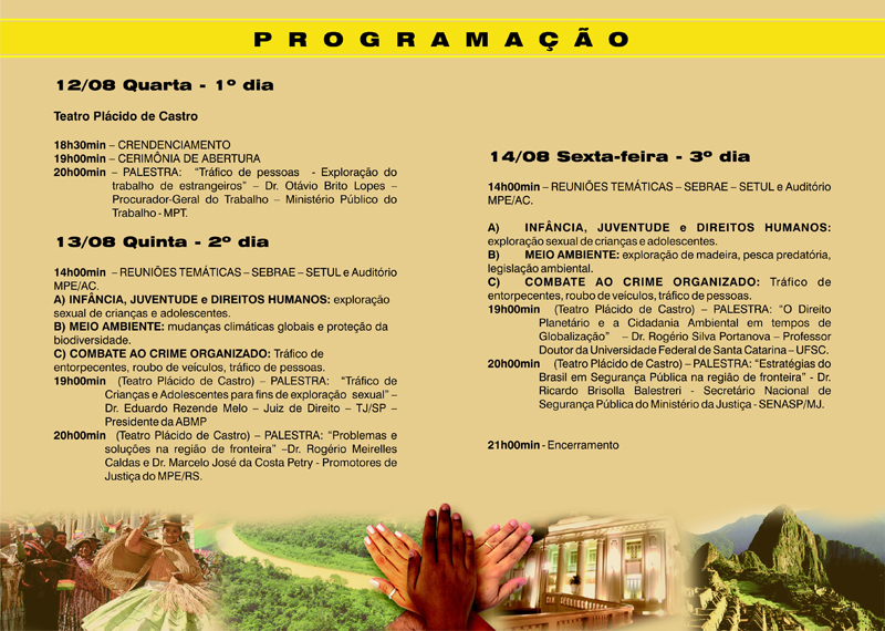 Confira aqui a programação completa do evento. Para mais informações, acesse o portal do Ministério Público do Estado do Acre.