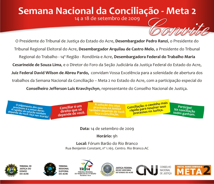 O Tribunal de Justiça do Acre, integrando o movimento desencadeado pelo Conselho Nacional de Justiça, irá participar, entre os dias 14 e 18 de setembro, da Semana Nacional de Conciliação dos processos distribuídos até 31 de dezembro de 2005, em cumprimento à Meta 2.