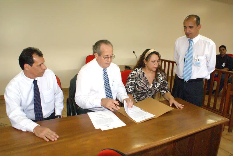 Após uma reunião com a Juíza, o Presidente utilizou o plenário do Tribunal do Júri para assinar o documento que transfere a caminhonete (Toyota, modelo Hilux CD 4X4 SR, zero km, ano 2009, cor branca), para a Direção do Foro de Senador Guiomard.