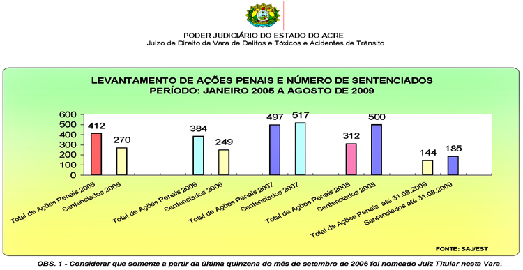 A Vara de Delitos de Tóxico e Acidentes de Trânsito da Comarca de Rio Branco já cumpriu a Meta 2 do Conselho Nacional de Justiça (CNJ). Assim, a unidade judiciária, cujo titular é o Juiz de Direito Elcio Sabo Mendes Júnior, julgou todos os processos distribuídos até 2005.