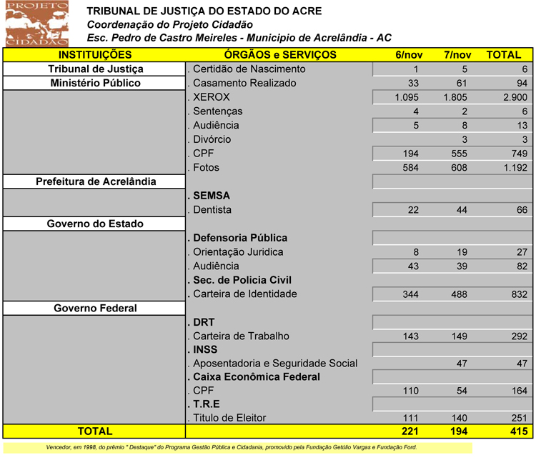 Desde o ano de 1995, quando foi instituído, o Projeto Cidadão conta com o apoio de diversos segmentos do poder público e da iniciativa privada, motivo pelo qual ele se ampliou e fortaleceu, sendo hoje umas das principais ações sociais do Poder Judiciário do Acre e referência em todo o Brasil.