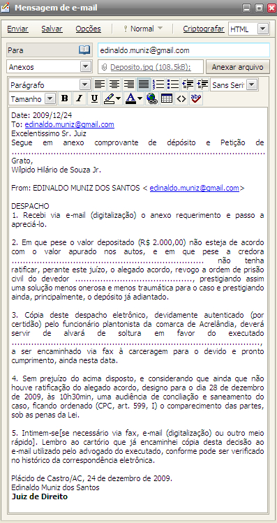No dia 24 de dezembro, o magistrado trabalhava no plantão, quando recebeu, por e-mail, requerimento do advogado Wilpido Hilário de Souza Júnior para expedição de alvará de soltura de seu cliente: um devedor de pensão alimentícia de Acrelândia que foi preso em Rio Branco, mas imediatamente pagou quase a totalidade do débito (veja aqui).
