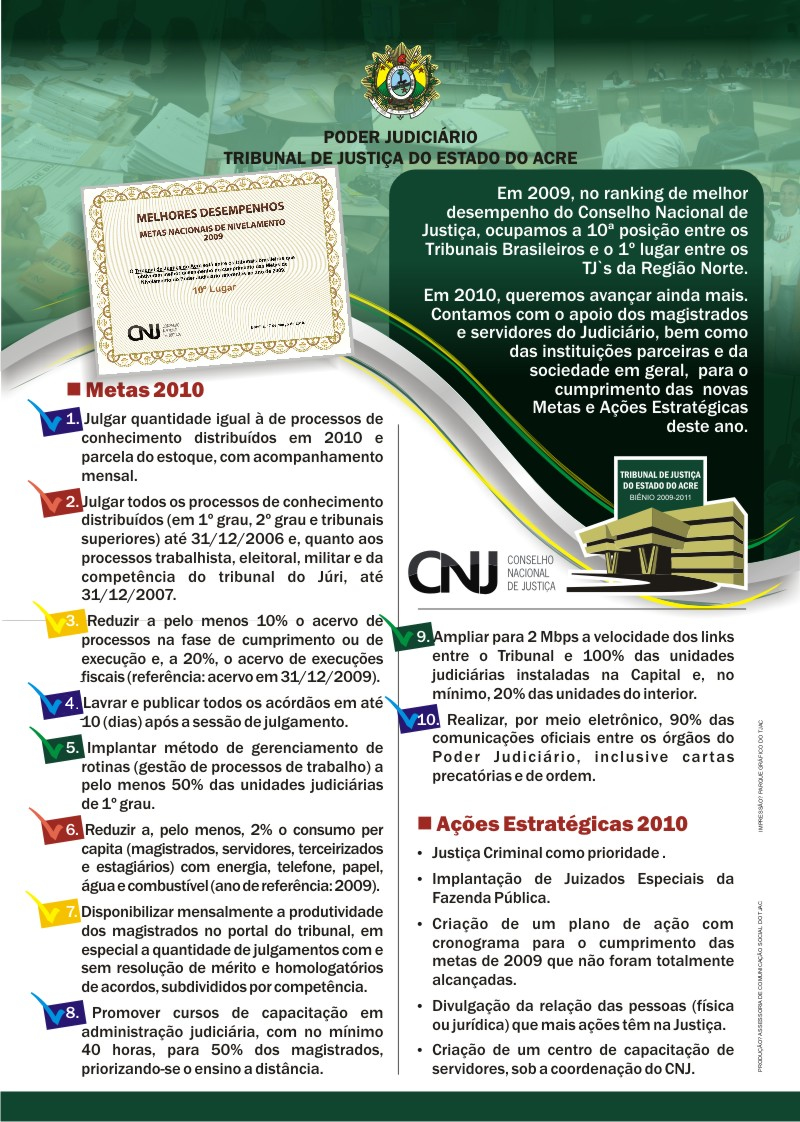 O Judiciário em Foco, informativo oficial do Tribunal de Justiça do Acre, apresentou em sua edição de dezembro de 2009 o resultado positivo do trabalho realizado para cumprimento das 10 Metas Nacionais de Nivelamento. Confira, a seguir, a edição especial do jornal sobre o tema.