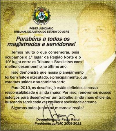 Ao receber o anúncio da premiação do TJAC, o Desembargador Pedro Ranzi, Presidente do Tribunal Acreano, declarou com muita satisfação: "Esse resultado confirma que somos hoje o melhor Poder Judiciário Estadual do Norte". Essa foi, inclusive, uma das orientações de trabalho anunciada por Pedro Ranzi na ocasião da sua posse, em fevereiro de 2009. "Todos os magistrados e servidores do Judiciário Acreano têm muito o que comemorar, pois isso é fruto do nosso esforço e união", ressaltou.