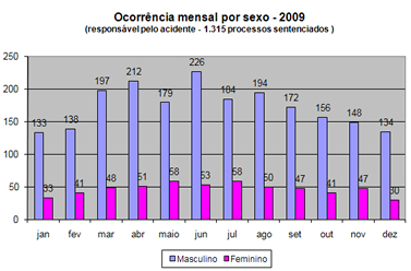 O maior número de ocorrências foi registrado no mês de junho: 226, tendo o sexo masculino como responsável, enquanto que apenas 58 tiveram como responsáveis motoristas do sexo feminino. O menor número de ocorrências tendo o sexo masculino foi registrado no mês de janeiro: 133. Já o menor número de ocorrências tendo como responsável o sexo feminino foi registrado no mês de dezembro: 30.