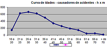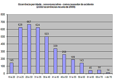 Outro dado interessante revelado pelo estudo diz respeito ao número de ocorrências, por idade, tendo o sexo masculino como maior causador de acidentes. Do total de 2.022 registradas em 2009, as estatísticas do JTRAN mostram que os motoristas que mais provocaram acidentes pertencem à faixa etária dos 21 aos 35 anos: foram 1.919 ocorrências, do total de 3.605 registradas. Os motoristas (sexo masculino) que menos causaram acidentes pertencem à faixa etária dos 45 aos 70 anos: 109 ocorrências.