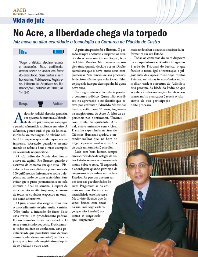 Com o título “No Acre, a liberdade chega via torpedo”, o jornal AMB Informa (edição de junho de 2010), publicação mensal da Associação dos Magistrados Brasileiros, destaca a experiência do Juiz de Direito Edinaldo Muniz, titular da Comarca de Plácido de Castro, ao aliar celeridade à tecnologia.