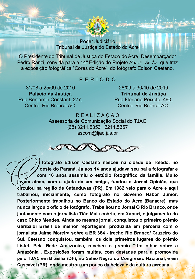 São 27 fotografias que descortinam as paisagens, natureza, cores e peculiaridades do Acre, desde Rio Branco até Manoel Urbano. Edison Caetano começou a fotografar aos 14 anos, ajudando o seu pai e, aos 16, assumiu o estúdio da família. Mora no Acre desde 1982, onde trabalhou em jornais como O Rio Branco, para o qual cobriu o caso Chico Mendes.