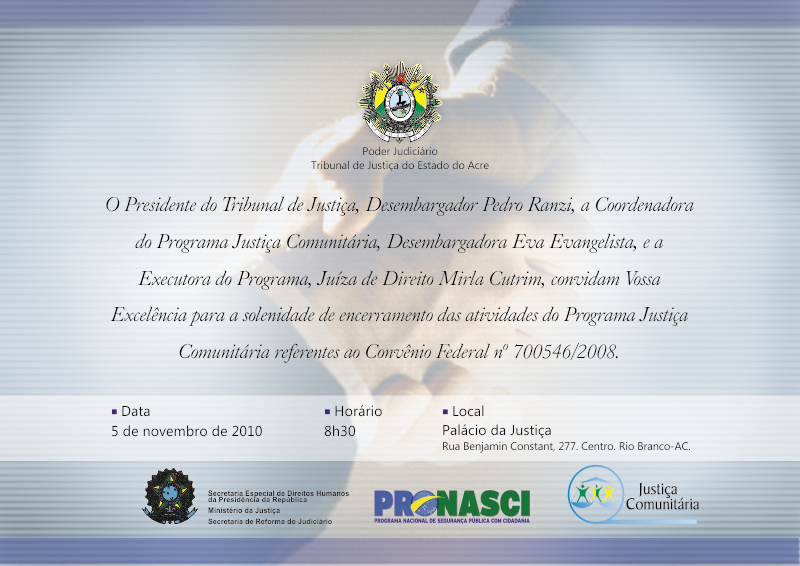 O Programa Justiça Comunitária, desenvolvido há oito anos pelo Tribunal de Justiça do Acre encerra nesta sexta-feira (05) as atividades referentes ao Convênio Federal 700546/2008, estabelecido entre o TJAC e a Secretaria Especial de Direitos Humanos da Presidência da República.