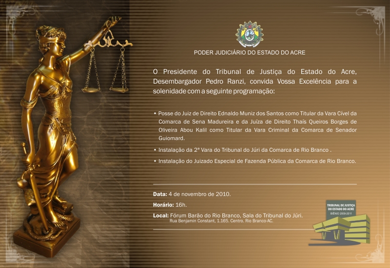 Durante a solenidade também serão instaladas a 2ª Vara do Tribunal do Júri e o Juizado Especial de Fazenda Pública, ambos da Comarca de Rio Branco. A instalação dessas duas unidades judiciárias foi aprovada pelo Tribunal Pleno Administrativo durante sessão extraordinária realizada no dia 23 de agosto deste ano.