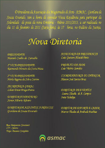A nova Diretoria da Associação dos Magistrados do Acre (ASMAC), eleita no dia 10 de dezembro de 2010 para o biênio 2011-2013, será empossada nesta sexta-feira (11). A solenidade de posse acontecerá às 17h, no Palácio da Justiça, no Centro de Rio Branco, e deve reunir a comunidade forense do Estado. O Presidente da Associação dos Magistrados Brasileiros (AMB), Nelson Calandra, será o convidado especial do evento.