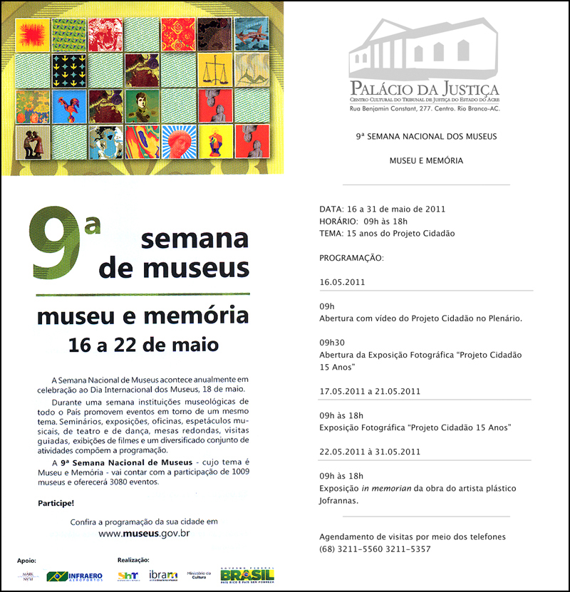 A abertura da Semana de Museus no Palácio da Justiça acontece na segunda-feira (16), às 9h. Na ocasião será exibido um vídeo do Projeto Cidadão, seguido da abertura da exposição fotográfica em memória dos seus 15 anos de existência. A mostra estará aberta ao público até o dia 21 de maio. Já os quadros do artista plástico Jorfrannas serão exibidos no período de 22 a 31 de maio.
