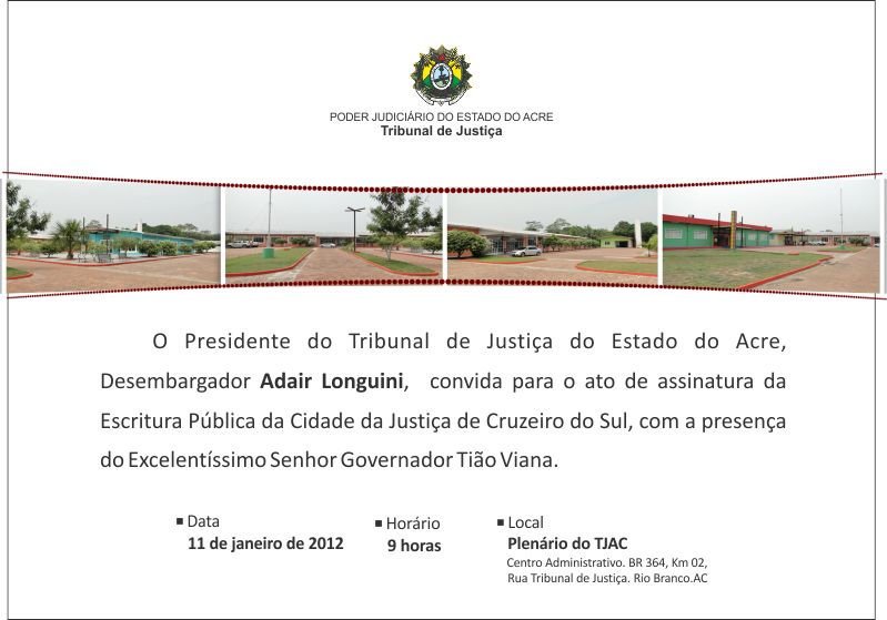 O Presidente do Tribunal de Justiça do Acre, Desembargador Adair Longuini, conduz nesta quarta-feira (11), às 9 horas, no plenário do TJAC, o ato de assinatura da Escritura Pública da Cidade da Justiça de Cruzeiro do Sul, que contará com a participação do Governador Tião Viana.