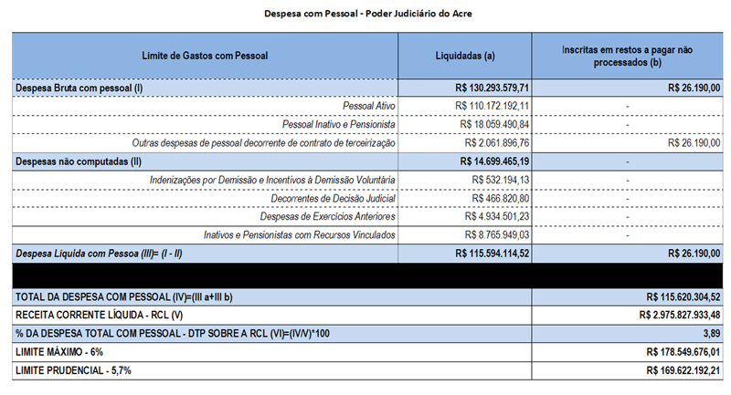 Desse modo, a auditoria atestou que o TJAC cumpre integralmente a Lei de Responsabilidade Fiscal (LRF), que limita a despesa de pessoal do Judiciário em 6% da Receita Corrente Líquida.