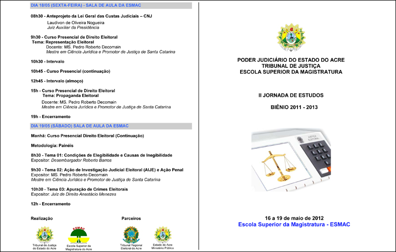 O Tribunal de Justiça do Acre e a Escola Superior da Magistratura (Esmac) irão realizar na próxima semana a II Jornada de Estudos de 2012. A atividade acontece a partir do dia 16 e se estende até o dia 19 de maio, sob a coordenação científica da juíza de Direito Olívia Ribeiro, titular da Vara de Violência Doméstica.