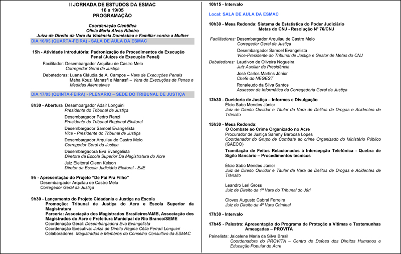 Na programação da Jornada de Estudos (veja íntegra) estão incluídas mesas redondas, palestras e painéis sobre os mais diversos temas, entre eles a palestra de apresentação do Programa de Proteção a Vítimas e Testemunhas Ameaçadas (Provita), que será ministrada pela Coordenadora do Programa, Jaicelene Brasil.