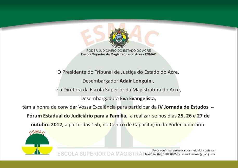 O Tribunal de Justiça e a Escola Superior da Magistratura do Acre (ESMAC) promoverão nos dias 25, 26 e 27 de outubro, o Fórum Estadual do Judiciário para a Família. O evento faz parte da IV Jornada de Estudos promovido pelo TJAC e o Órgão de Ensino no ano de 2012.