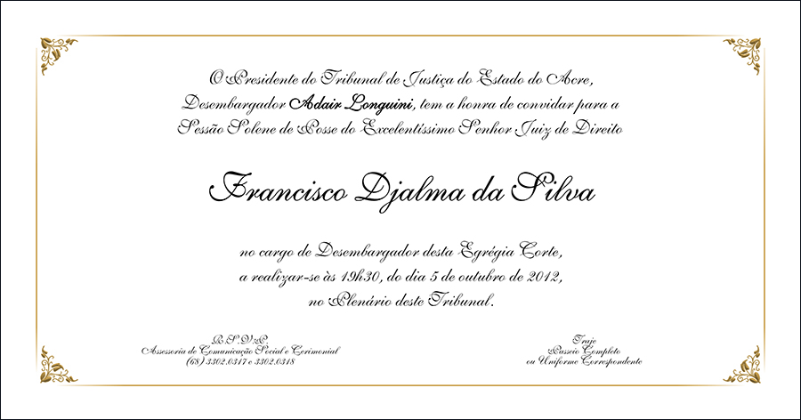 O juiz Francisco Djalma da Silva será empossado no cargo de desembargador do Tribunal de Justiça do Estado do Acre na noite desta sexta-feira (05).