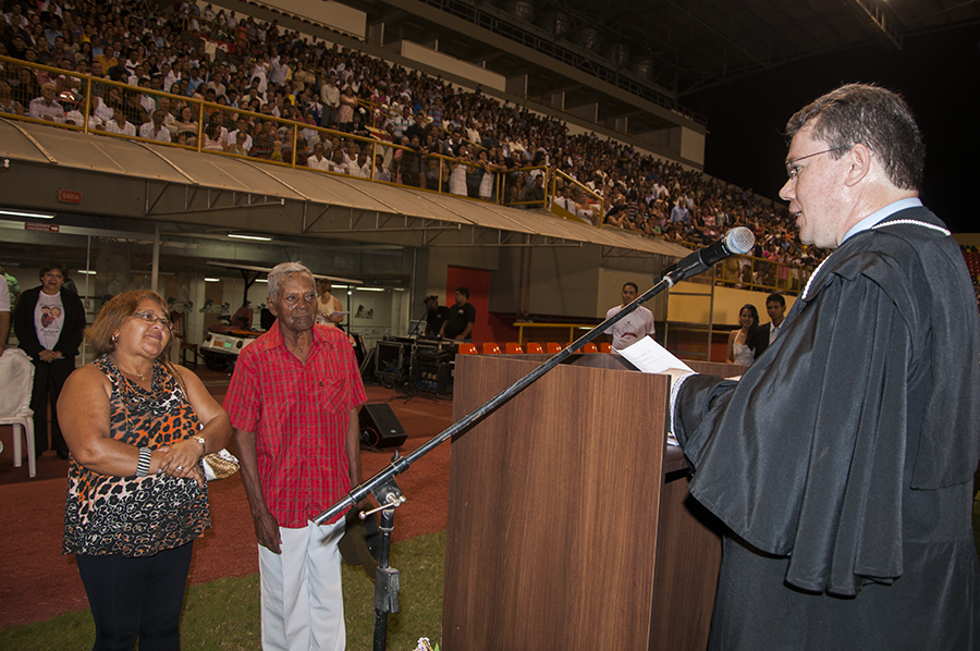 Os 2.200 noivos presentes foram representados diante do juiz pelo casal mais jovem, formado por Maria Elisabeth (16) e Gustavo Silva (16), e pelo casal mais maduro, formado por José Pereira da Silva (100) e Maria da Conceição da Silva (52).