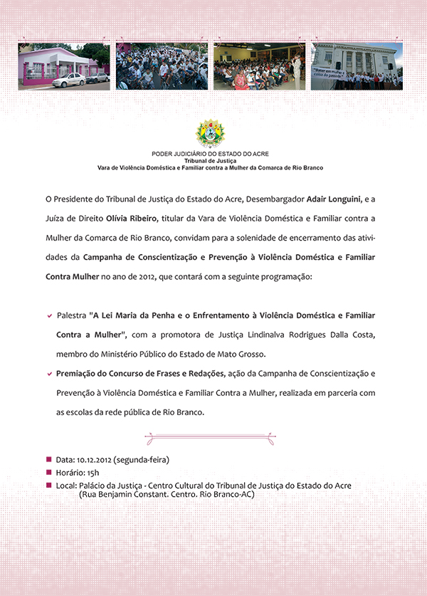 Solenidade de encerramento das atividades da Campanha de Conscientização e Prevenção à Violência Doméstica e Familiar Contra a Mulher no ano de 2012. Quando: segunda-feira (10), às 15 horas. Onde: Palácio da Justiça – Centro Cultural do TJAC (Rua Benjamin Constant, 277, Centro. Rio Branco-AC). |