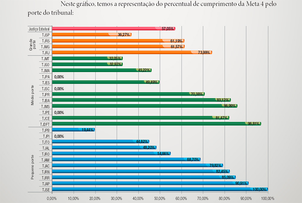 Já a Meta 4 previa o “julgamento de todas as ações ajuizadas até o fim de 2008”. Nesse caso, o Tribunal de Justiça Acreano alcançou 79,82%, ocupando assim a quinta posição entre os tribunais de pequeno porte e em nono lugar entre todos os tribunais estaduais do País.