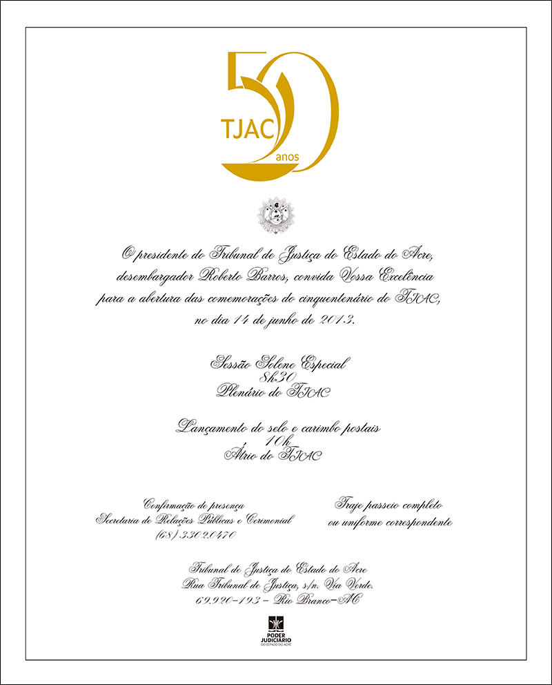 As comemorações pelos 50 anos de instalação do Tribunal de Justiça do Acre terão início oficialmente nesta semana. Na próxima sexta-feira (14), o desembargador-presidente Roberto Barros conduzirá na sede da instituição a sessão solene que marcará a abertura, à qual se somará o lançamento de selo e carimbo postais alusivos ao cinquentenário do TJAC.