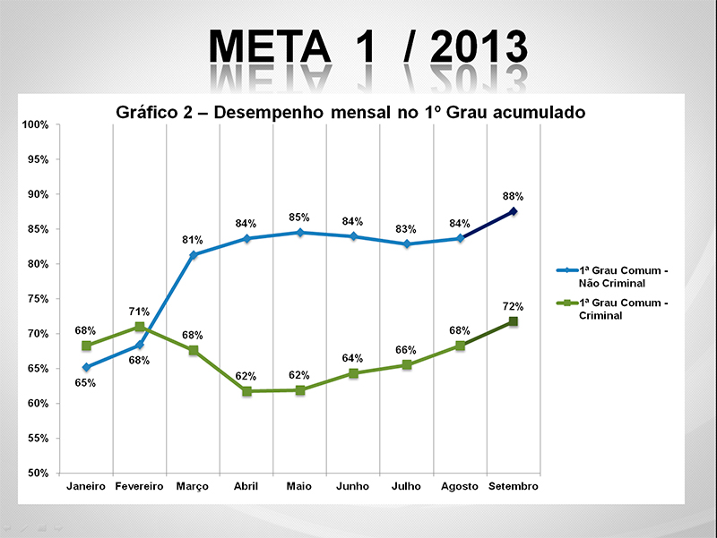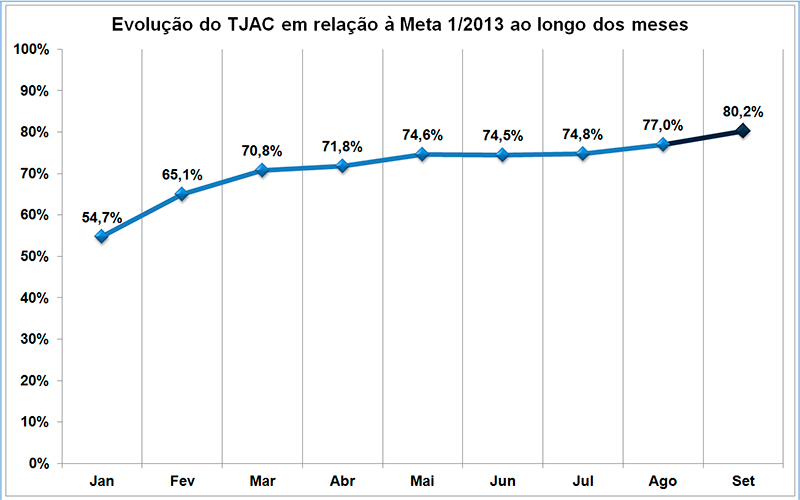 Conforme atestam os valores acumulados no período de nove meses, no âmbito do 1º Grau, o TJAC obteve um percentual positivo de alcance dessa Meta, saindo de 54,7% em janeiro para 80,2% em setembro deste ano.