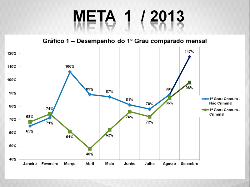 No comparativo de desempenho mensal, o 1º Grau comum saiu de 67% em janeiro para 110% em setembro, sendo este o melhor resultado mensal do ano. Enquanto isso, os Juizados Especiais estavam com 46% (também em janeiro) e evoluíram para um índice de 103% em setembro.