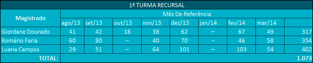 O mesmo relatório aponta que a 1ª Turma Recursal julgou 1.073 processos nesse mesmo espaço de tempo, divididos entre os juízes relatores Giordane Dourado, Romário Divino e Luana Campos.
