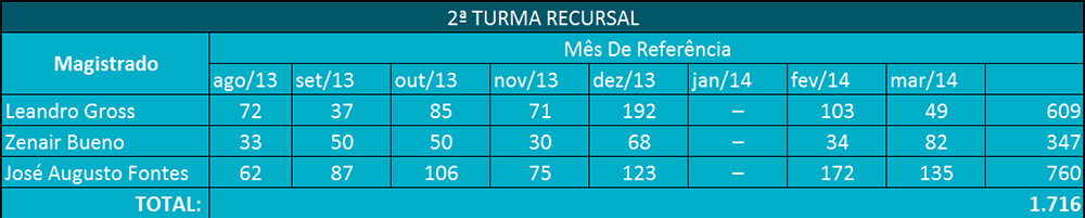 Entre agosto de 2013 e março de 2014, houve um total de 1.716 julgamentos, distribuídos entre os magistrados relatores Leandro Gross, Zenair Bueno e José Augusto Fontes, os quais integram o Órgão Julgador.