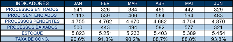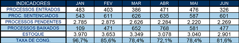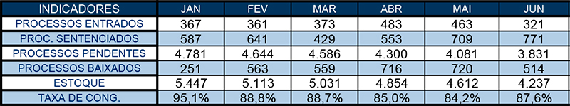 3.323 processos foram baixados nesse meio tempo contra 2.368 casos novos, de modo que para 100 processos que ingressaram, 140 foram baixados. No que diz respeito ao estoque da unidade, houve uma redução de 1.210 processos, saindo-se de 5.447 em janeiro para 4.237 em junho.