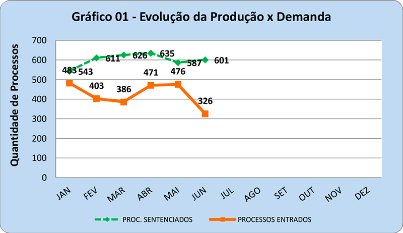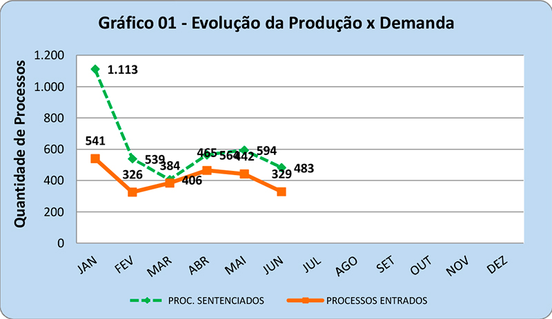 Por outro lado, de 2.917 processos baixados, 2.487 eram casos novos, de tal sorte que para cada 100 processos que entraram, 117 foram baixados. Já em relação ao estoque da unidade, houve uma redução de 369 processos, saindo de 5.823 em janeiro para 5.454 em junho deste ano.