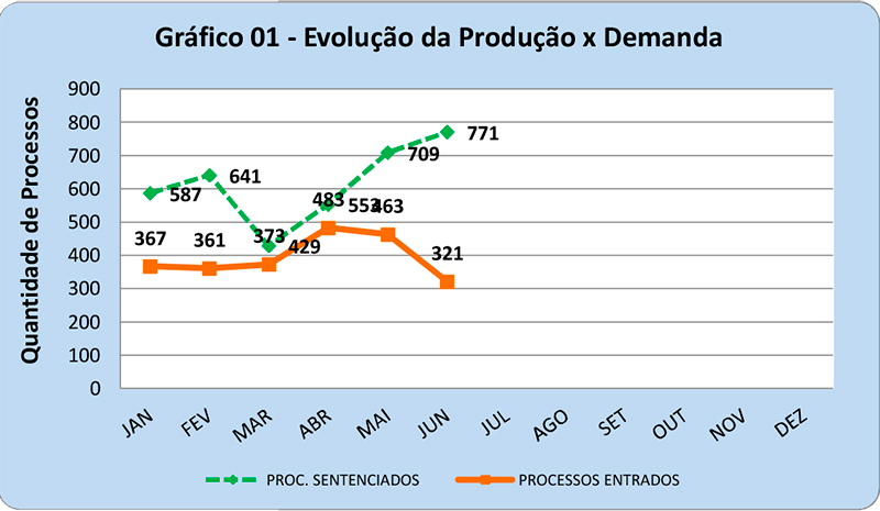 Não menos importante, nesse mesmo período, obteve-se a quantidade de 3.058 processos baixados contra 2.545 casos novos, o que demonstra que estão sendo baixados mais processos do que os que ingressam na unidade. Houve uma redução de 1.069 processos no estoque, saindo de 3.970 em janeiro para 2.901 em junho.