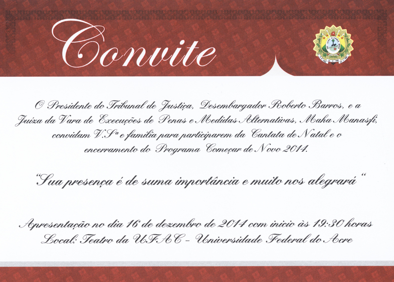 O Tribunal de Justiça do Acre, através da Vara de Execuções de Penas e Medidas Alternativas de Rio Branco (Vepma), realiza na noite desta terça-feira (16), no Teatro da Universidade Federal do Acre (Ufac), a cerimônia de encerramento das atividades do Programa Começar de Novo em 2014.