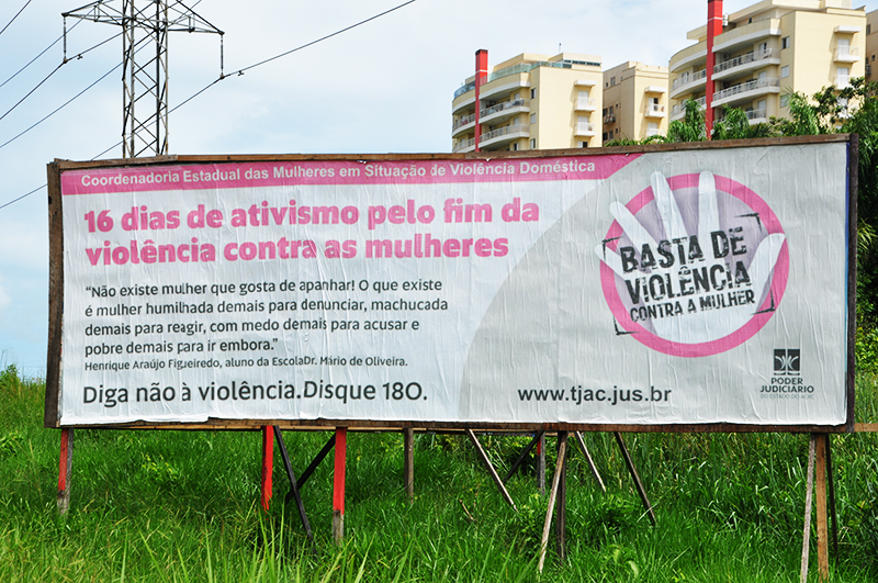 O Tribunal de Justiça do Acre apresentou nesta semana, por meio da publicação em outdoors, as frases vencedoras do concurso de Frases e Redações, promovido pelas Coordenadoria Estadual das Mulheres em Situação de Violência Doméstica e Vara de Violência Doméstica e Familiar, em parceria com escolas da rede pública de ensino da Capital acreana, que participaram das atividades desenvolvidas durante a realização da campanha “16 dias de ativismo pelo fim da violência contra as mulheres” e do projeto “Semeadores da Paz”.
