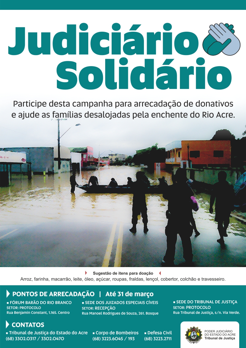 A equipe do comitê responsável pela campanha “Judiciário Solidário” vai recolher nesta terça-feira (3), nos setores que integram a sede do Tribunal, as doações destinadas às famílias desalojadas pela enchente do Rio Acre. Já na quarta-feira (4), os donativos serão recolhidos nas outras unidades: Fórum Barão do Rio Branco, sede dos Juizados Especiais Cíveis e no Fórum Criminal da Cidade da Justiça.