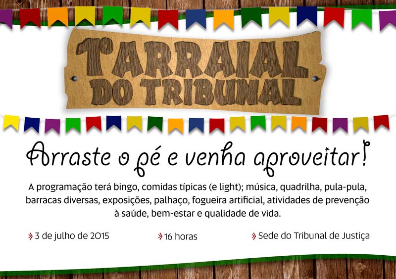 Com uma rica programação, recheada de muita música, quadrilha, brincadeiras diversas, bingo (com bicicleta, tablet e TV de 40”), várias barracas (como de artesanato e plantas), exposições, palhaço, fogueira artificial, comidas típicas (e light), o 1º Arraial do Tribunal de Justiça do Acre – que vai acontecer na semana que vem (sexta-feira, 3, a partir das 16h), na Sede Administrativa do Judiciário Acreano -, já é aguardado com grande expectativa no âmbito da instituição.