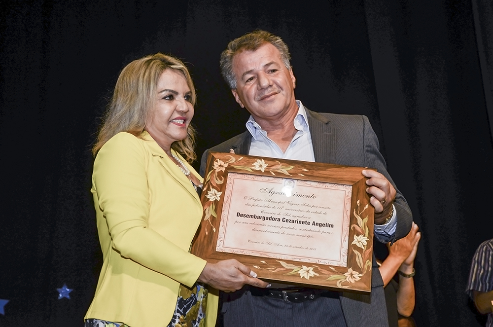 A presidente do Tribunal de Justiça do Acre, desembargadora Cezarinete Angelim, foi a homenageada durante o lançamento da programação do 111º Aniversário de Cruzeiro do Sul. Ela recebeu das mãos da primeira dama, Antônia Sales, um presente (obra em marchetaria) e, do prefeito Vagner Sales, um diploma de agradecimento, “pelos relevantes serviços prestados, os quais contribuíram para o desenvolvimento do município”.