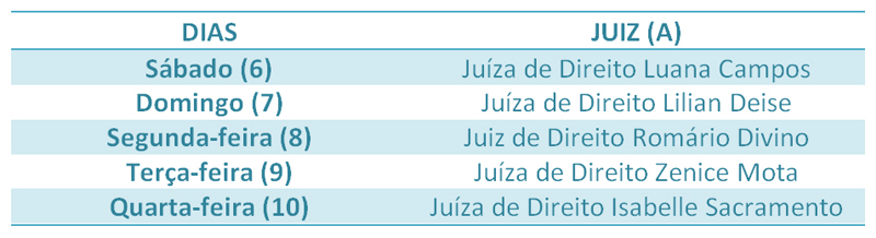 O Plantão Judiciário ocorrerá no período compreendido entre às 7h até as 18h em regime de plantão efetivo, e das 18h às 7h do dia seguinte, em regime de sobreaviso.