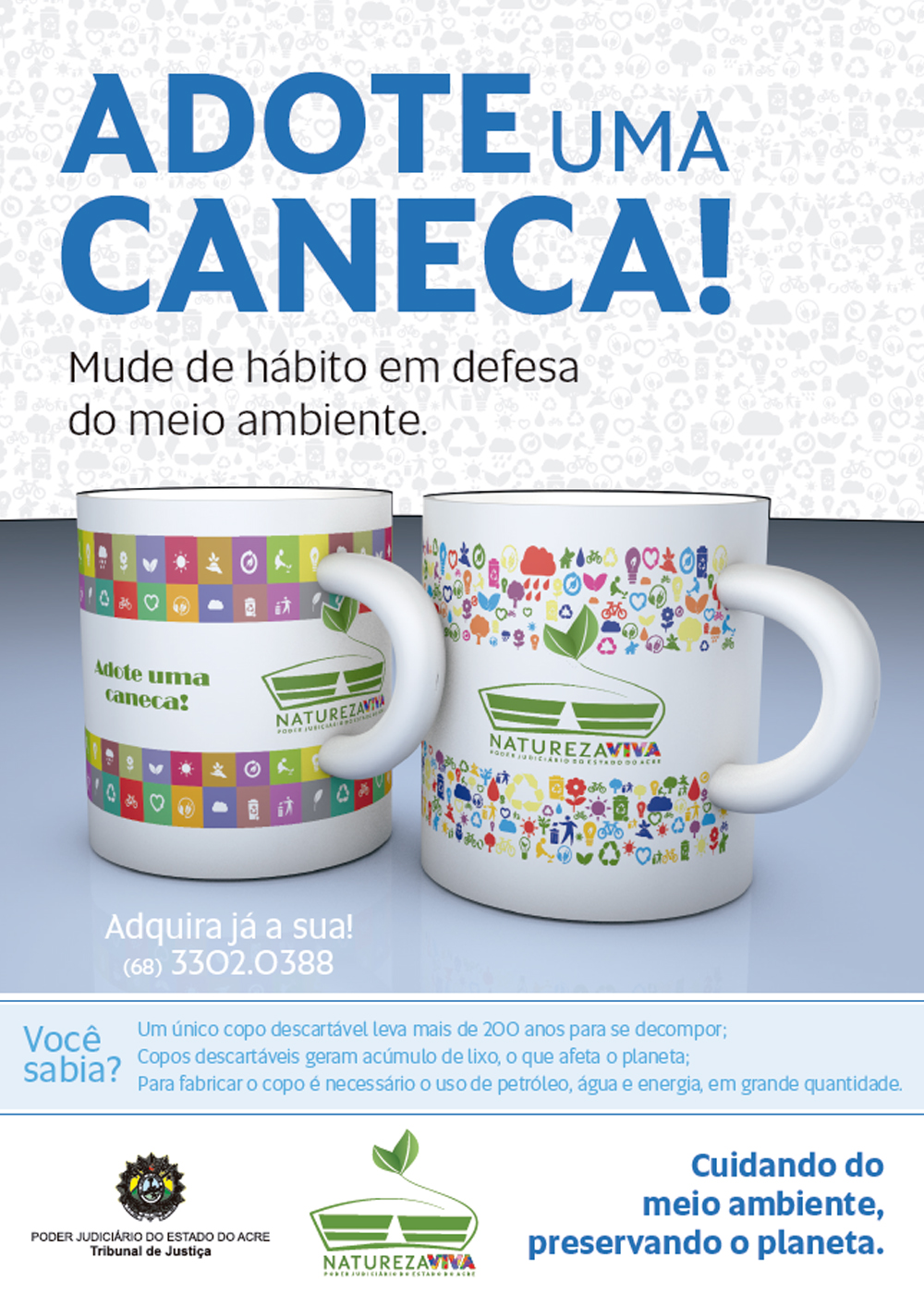 Com o slogan “mude de hábito em defesa do meio ambiente”, o Tribunal de Justiça do Acre lança a campanha Adote uma Caneca, com o intuito de conscientizar magistrados, servidores e a sociedade para a preservação do planeta, com a redução do consumo de copos descartáveis.