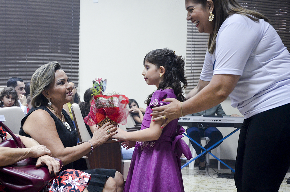 Em seguida, o Miguel, filho da servidora Giuliana Evangelista (neto da desembargadora Eva), e a Izabelly, filha da servidora Raquel Daou, entoaram canções relativas ao amor incondicional das mães, e como os filhos mudam o sentido de suas vidas.