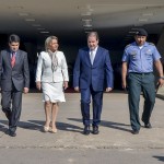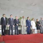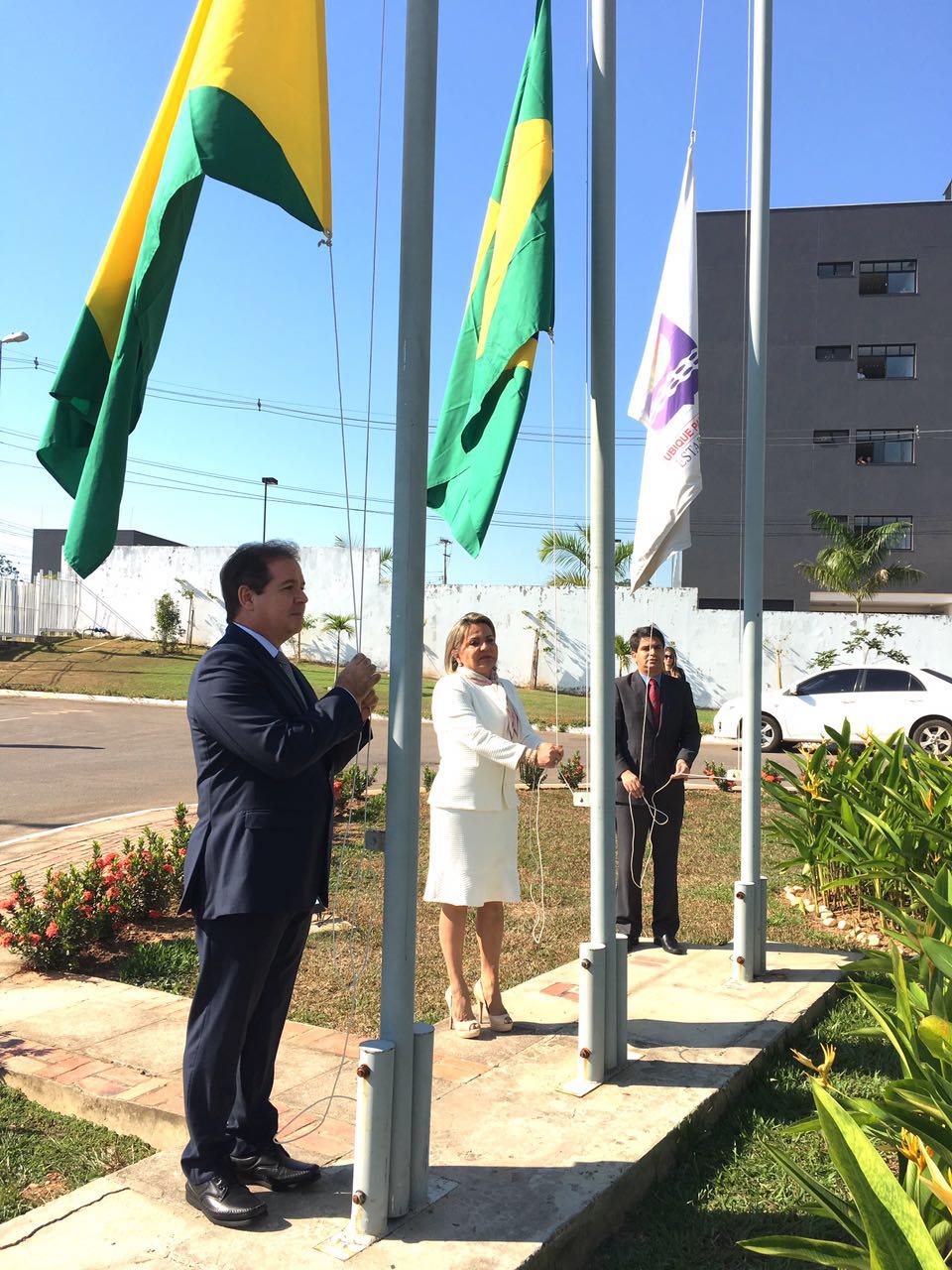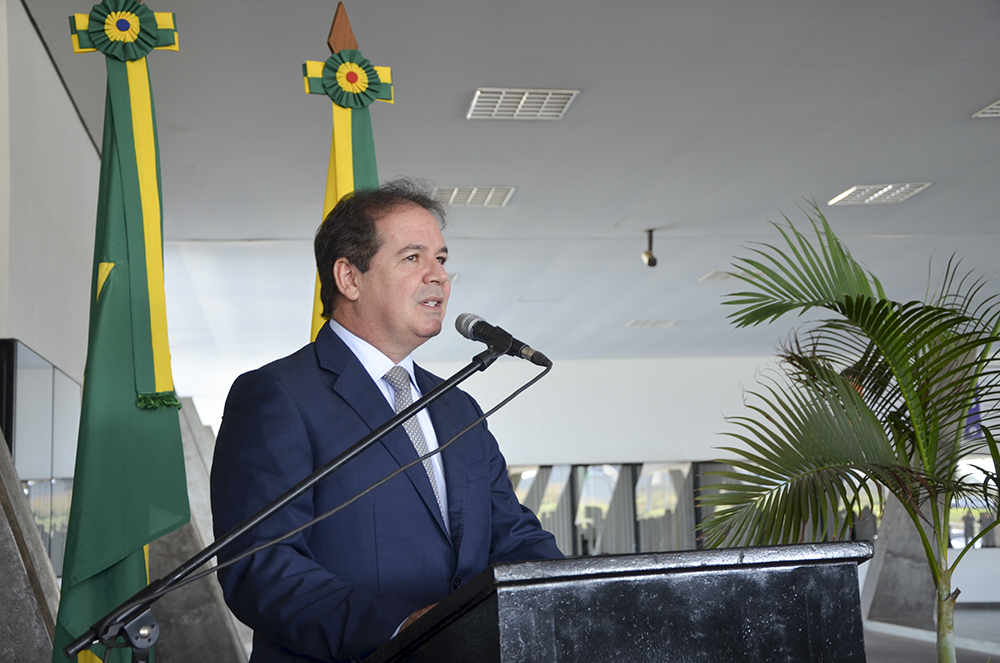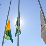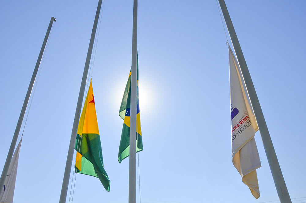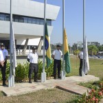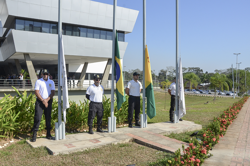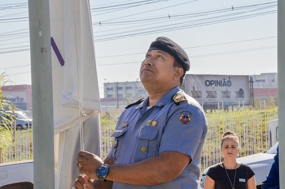 As autoridades, em companhia do secretário Emylson Farias, e do coronel Júlio César, procederam com o hasteamento dos pavilhões Nacional, Estadual, Municipal e do Mercosul, ao som do Hino Nacional Brasileiro, executado pela Banda da Música da PMAC.