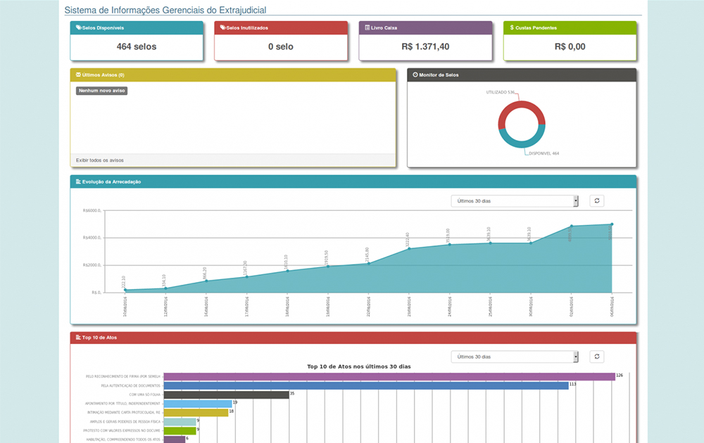 O sistema gera os selos para as serventias, controle de arrecadação de custas, importa atos praticados pelas unidades, inclusive atos compostos ou complexos e diferidos, fornece acompanhamento dos livros-caixa, de depósito prévio e de atos diferidos, e disponibiliza gráficos de apoio à tomada de decisões.