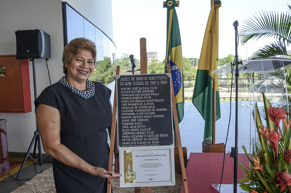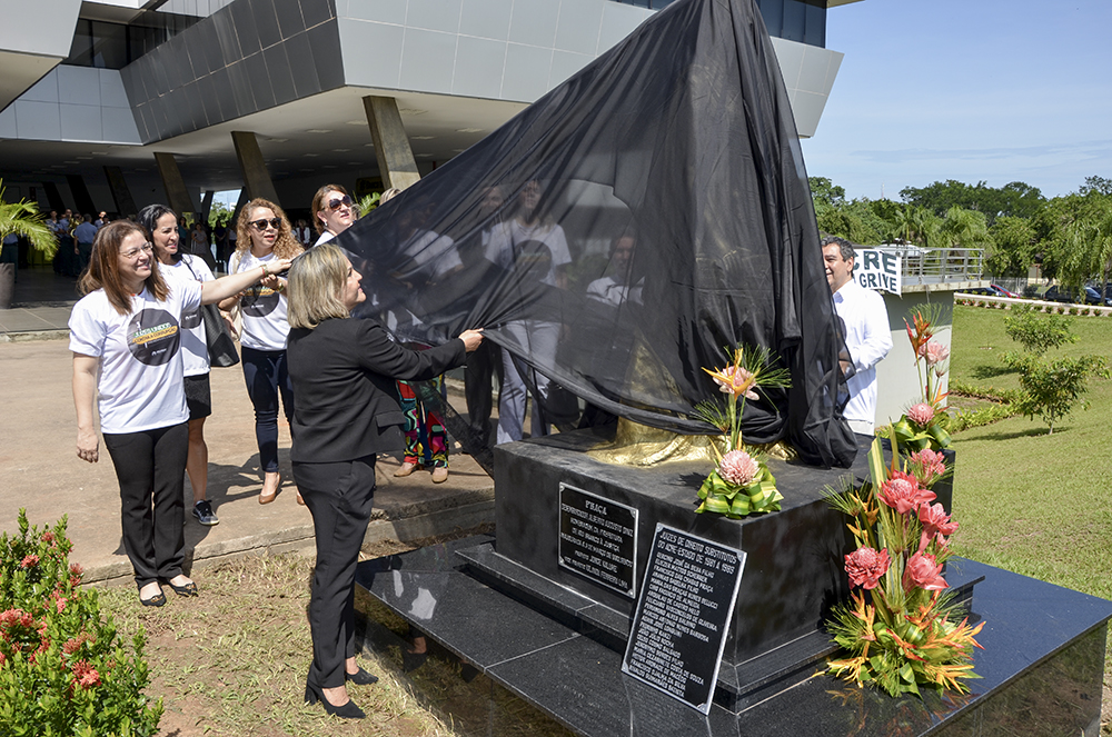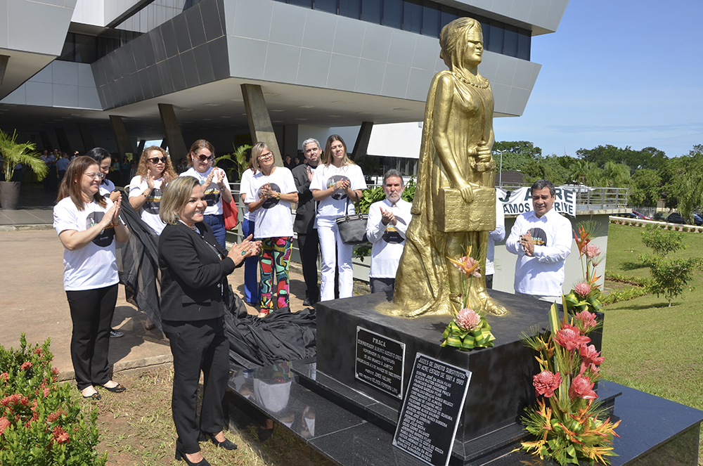 “A pedra bruta transformada em arte pelas mãos do artista plástico Jorge Rivasplata, e restaurada pelo artista plástico Péricles José da Silva, oferecida ao Tribunal de Justiça na época do então prefeito Jorge Kalume, traduz em sua forma e plasticidade a razão de ser da nossa Instituição”, declarou a presidente do TJAC ao referir-se à estátua-símbolo da Justiça.