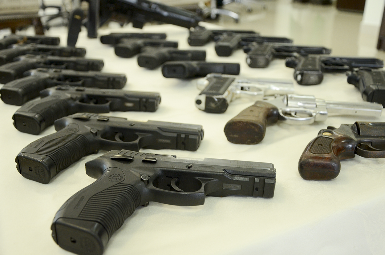 Foram devolvidas uma metralhadora, pistola ponto calibre 40, pistola calibre 380, e revólver calibre 38. Essa é a primeira entrega de armamento, coletivamente, já feita por uma gestão do TJAC.