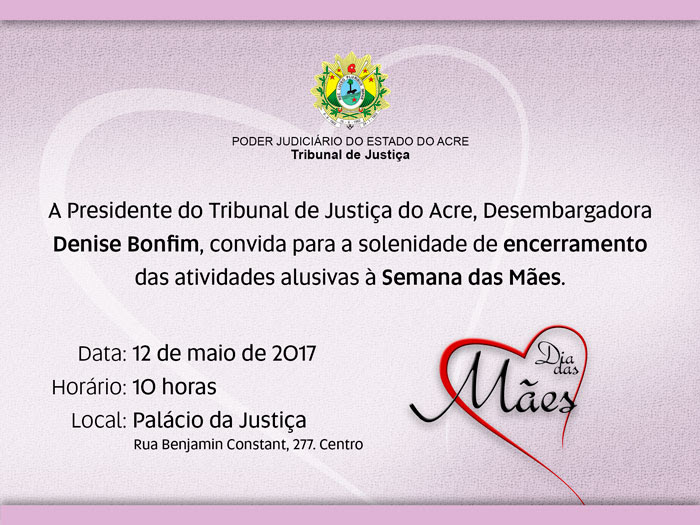 A programação da Semana das Mães do Poder Judiciário Acreano termina nesta sexta-feira (12), com diversas atividades no Palácio da Justiça. Entre as ações, que iniciarão às 10h, está a apresentação do Coral do TJAC, que deve emocionar o público. Além disso, haverá stand de fotografias, desfile de mães e filhos e entrega de brindes. O evento é aberto ao público em geral.